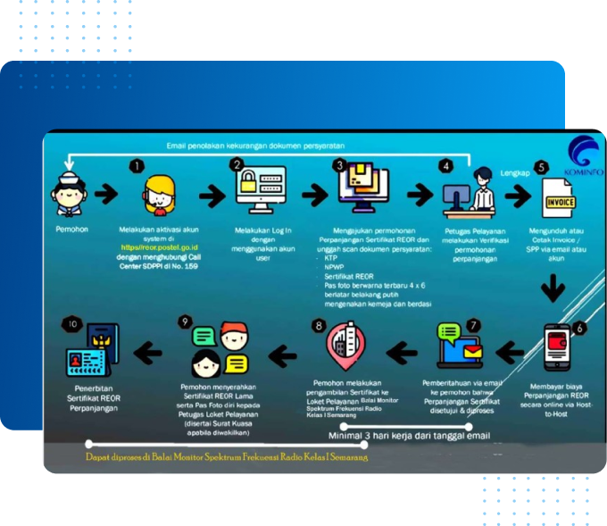 Guna mengakomodir kebutuhan stakeholder dan dalam rangka akselerasi tranformasi digital, Ditjen SDPPI telah meluncurkan sistem layanan perpanjangan Sertifikat Radio Elektronika dan Operator Radio (REOR) yang dapat diakses secara daring dan terintegrasi dengan aplikasi booking online. Pengembangan aplikasi ini dilakukan untuk mempermudah pengajuan permohonan dalam perpanjangan Sertifikat REOR..