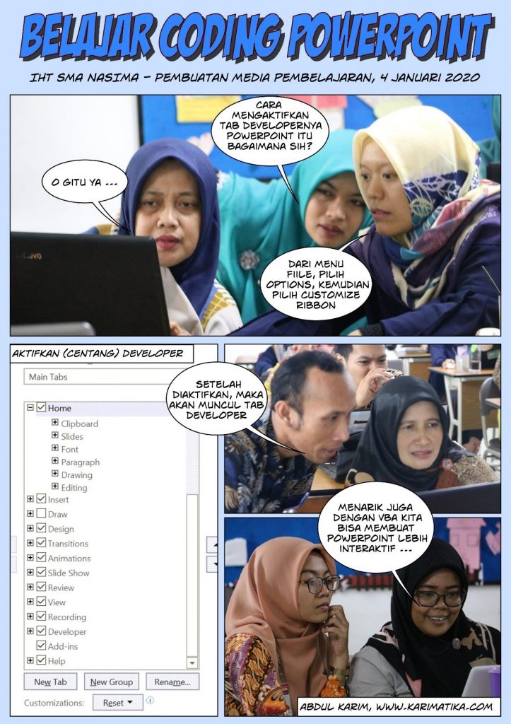 “Kita biasa menggunakan Powerpoint. Tetapi ternyata masih banyak fitur-fitur dan coding yang belum kita ketahui sebelumnya. Dengan IHT ini kita bisa meningkatkan presentasi-presentasi kita menjadi lebih menarik dan interaktif,” kata salah satu peserta IHT, Mualifah SAg. “Saya tertarik materi komik pembelajaran. Anak-anak akan menjadi lebih senang foto-foto mereka menjadi subjek komik. Materi pun bisa tersampaikan secara lebih gaul dan harapannya menjadi lebih mudah diterima. Adanya foto komik dan tulisan yang menarik tentunya akan membuat budaya literasi peserta didik pun lebih meningkat,” kata Wakil Kepala SMA Nasima Bidang Kurikulum, Eni Setyaningsih SPd.