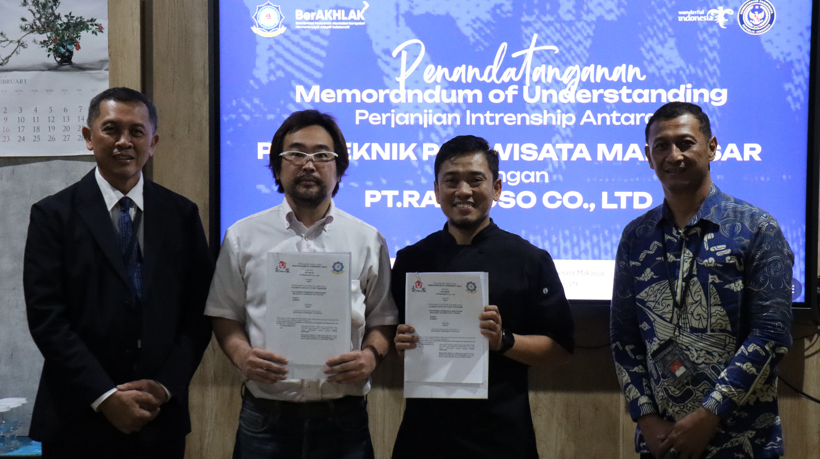 Makassar, 19 Februari 2025 – Politeknik Pariwisata (Poltekpar) Makassar resmi menandatangani Memorandum of Understanding (MoU) dengan PT Rakusho Co., LTD dalam rangka kerja sama program internship bagi mahasiswa Program Studi Seni Kuliner. Penandatanganan MoU ini menandai langkah strategis dalam memperkuat hubungan antara dunia akademik dan industri kuliner internasional.